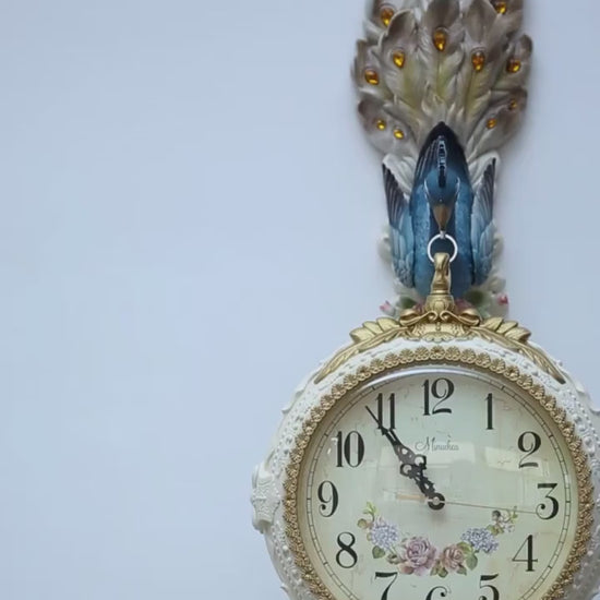 dual dial wall clock, peacock wall clock, luxury double-sided clock, roman numeral wall clock, decorative living room clock, vintage dual side wall clock, peacock decorative clock.