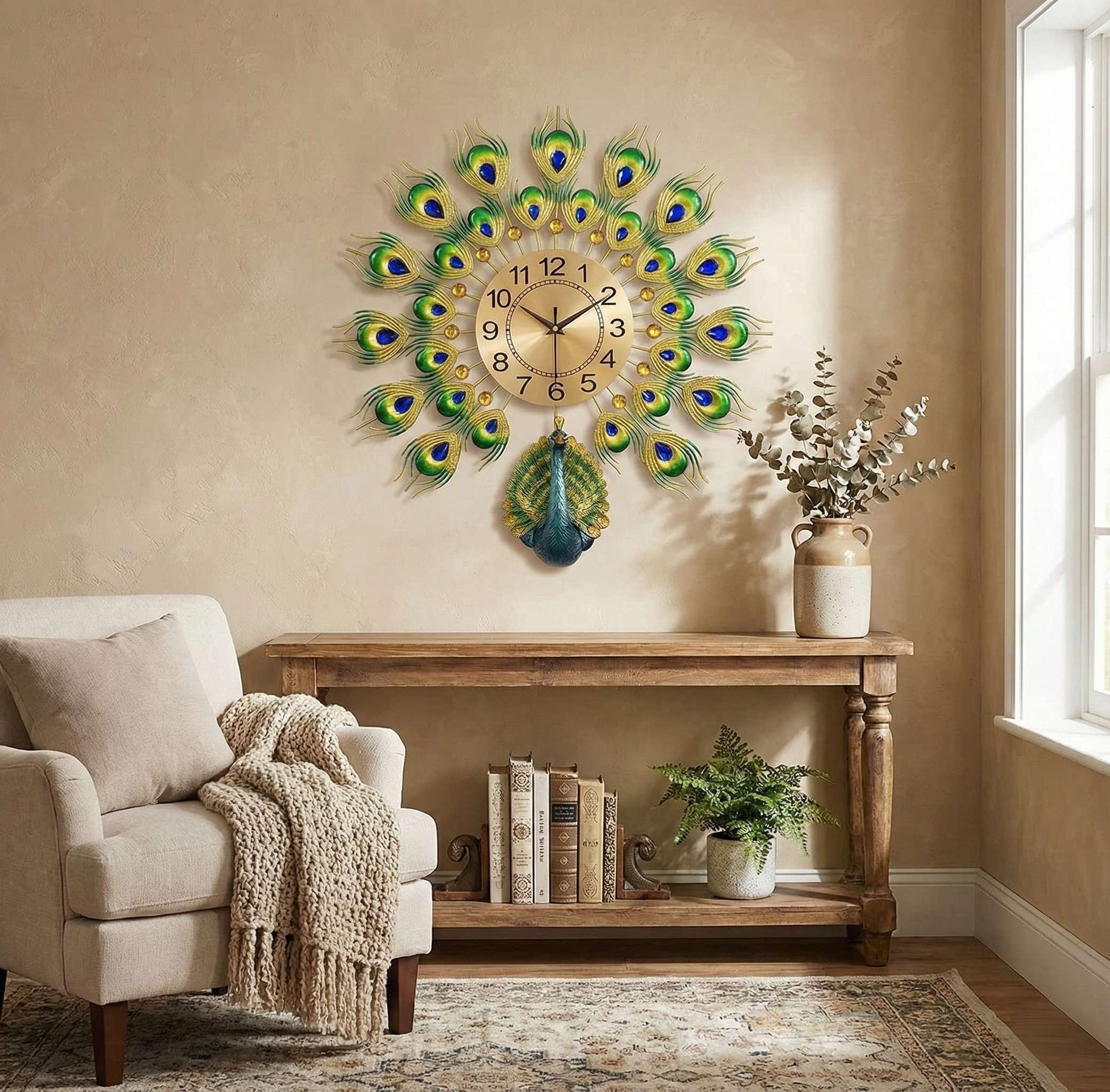 Bring a touch of royalty and prosperity to your home with the FunkyDecors Royal Peacock Metal Wall Clock. Designed to be more than just a timepiece, this masterpiece serves as a stunning focal point for your living room, bedroom, or hallway.