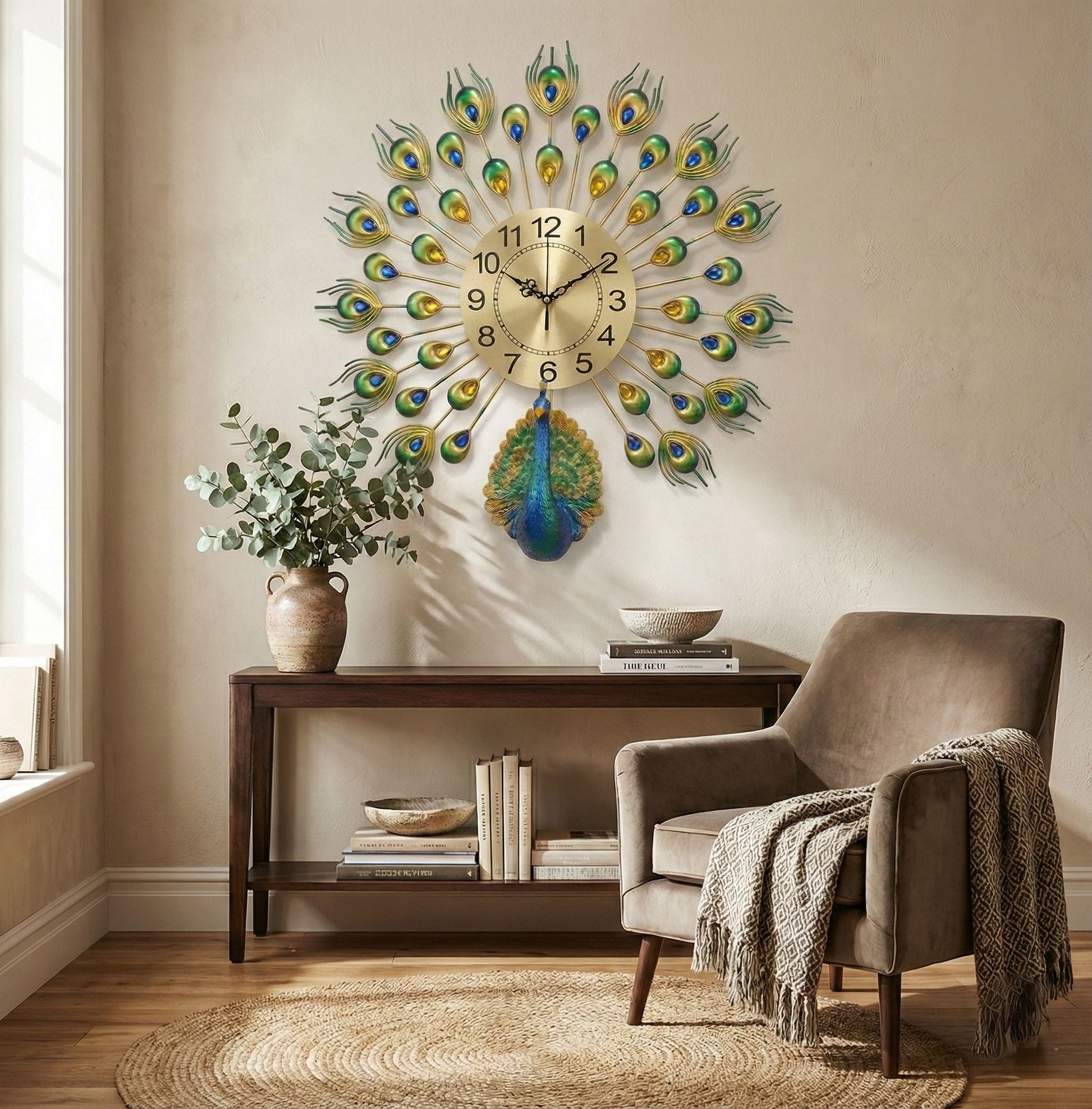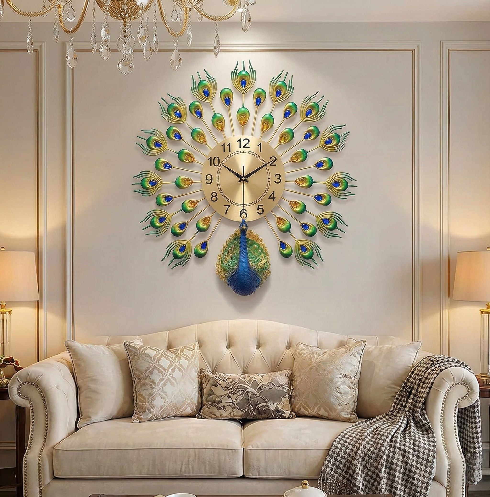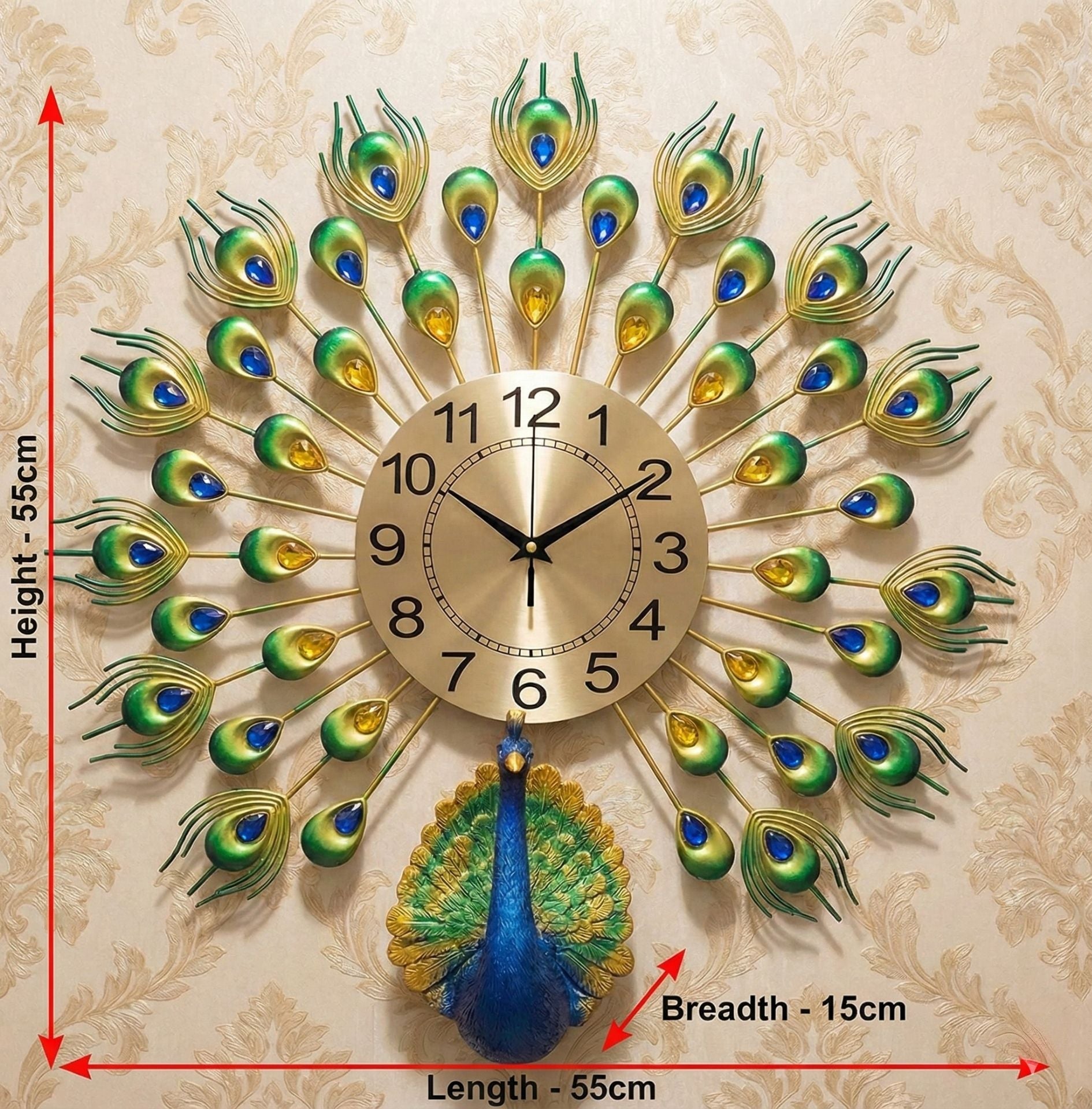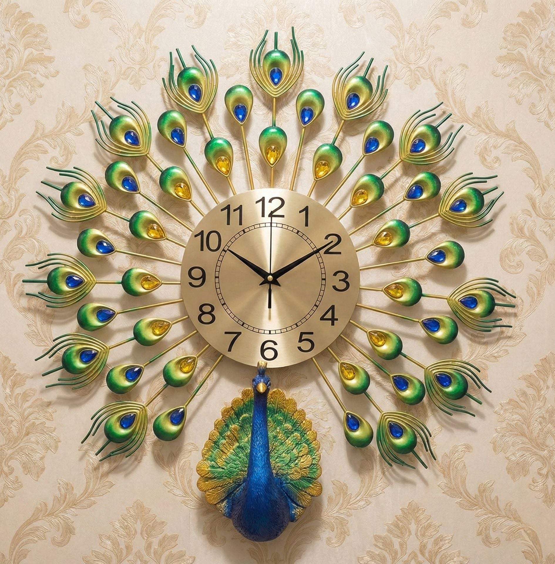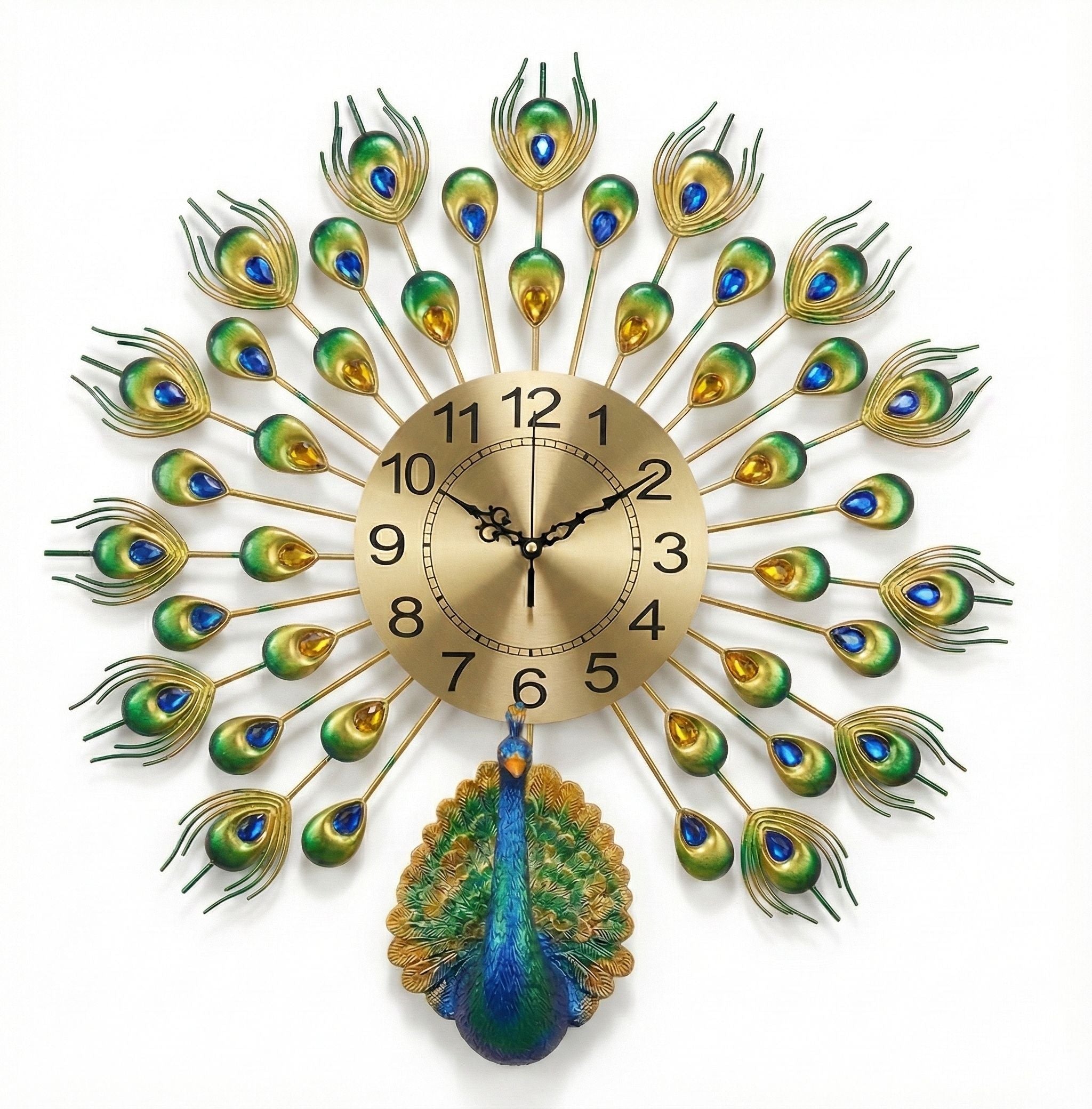 The design features a beautiful peacock with feathers spreading out, decorated with sparkling crystal stones in green, blue, and gold colors. The golden dial makes it easy to read the time while looking elegant. Whether you want to decorate your living room, bedroom, or office, this clock fits perfectly with modern and traditional interiors.